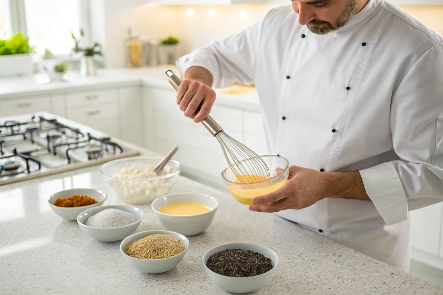 Żółtka jajek są doskonałym zagęstnikiem do sosów kremowych, takich jak holenderski czy béarnaise. Kluczem do sukcesu jest technika tempering – stopniowe dodawanie gorącego sosu do żółtek, aby zapobiec ich ścięciu: