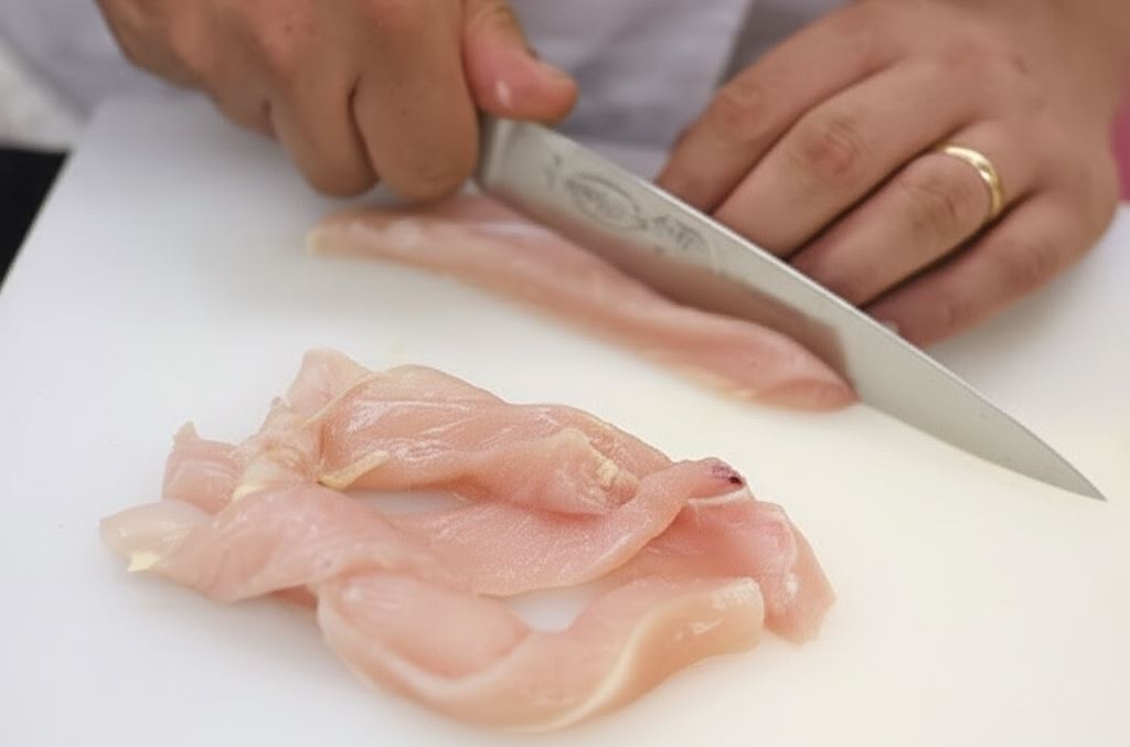 Filety oczyść z błonek, podziel na mniejsze kawałki, a potem pokrój w paski o szerokości około 1,5 cm. W miseczce połącz miód ze śmietaną i włóż do niego kurczaka. Wszystko starannie wymieszaj, umieść w chłodnym miejscu i marynuj przez około 2 godziny.