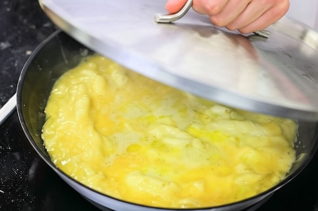 Tłuszcz podgrzej na patelni, wlej mieszankę jajeczną, poruszaj patelnią, aby masa spłynęła na spód, gdy się spód zarumieni na moment nakryj pokrywką.