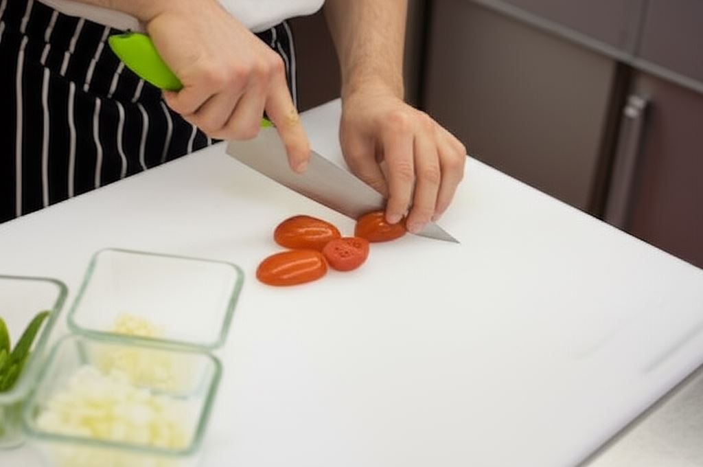 Przygotuj wszystkie warzywa: cebulę i czosnek obierz, po czym dość drobno posiekaj. Pomidorki opłucz, osusz i przekrój na połówki. Z papryk wyciągnij gniazda nasienne, a pozostałą część pokrój w niezbyt szerokie paski.