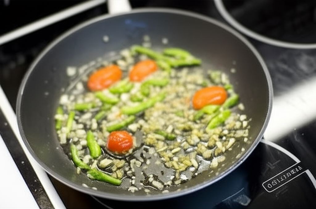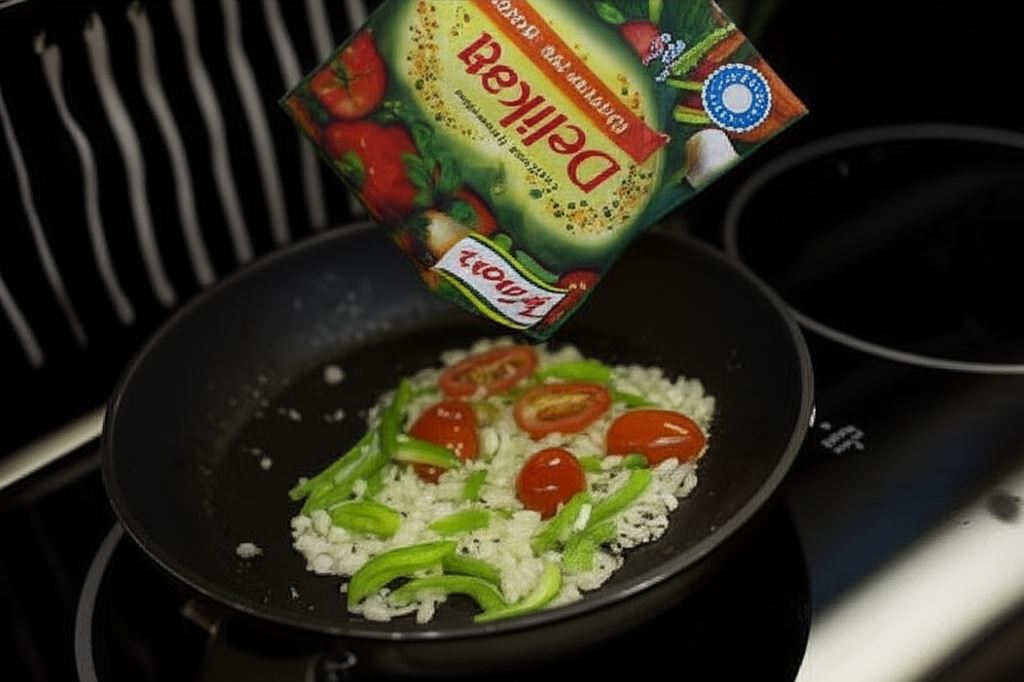 Wlej odrobinę oliwy na patelnię. Gdy tłuszcz się rozgrzeje, zeszklij cebulę z czosnkiem. Potem dodaj pomidorki, paprykę i przypraw przyprawą Knorr, pieprzem, bazylią i suszonym oregano. Podsmażaj wszystkie składniki, mieszając je często.