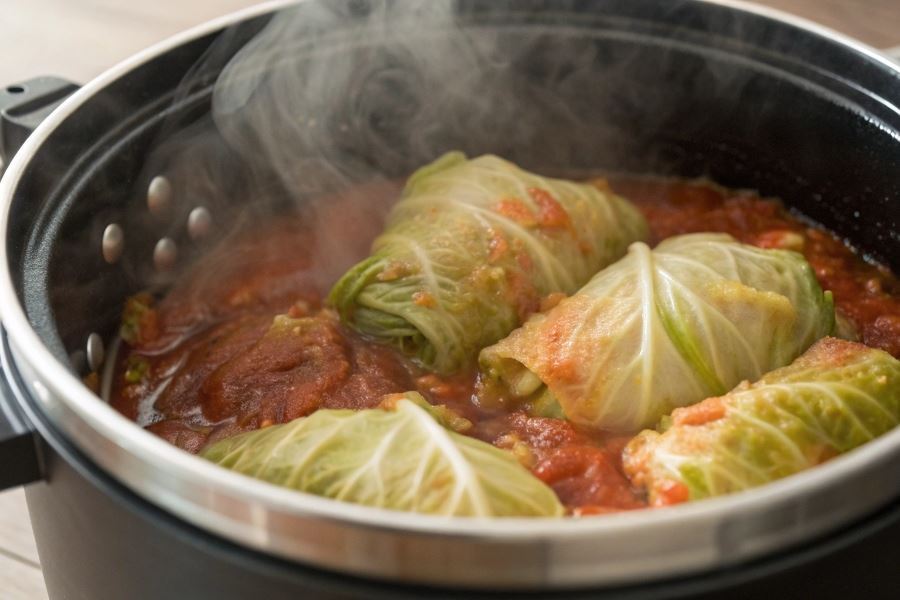 Wskazówka eksperta: Dla uzyskania najlepszego smaku, ustaw tryb „Duszenie” na 75 minut przy 85°C, a następnie pozostaw gołąbki w funkcji podtrzymywania ciepła przez dodatkowe 15-20 minut.