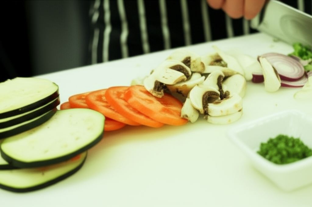 Bakłażany i cebule potnij na plastry średniej grubości, tak samo papryki i pomidory. Posiekaj szczypior oraz natkę. Pieczarki pokrój w plasterki.