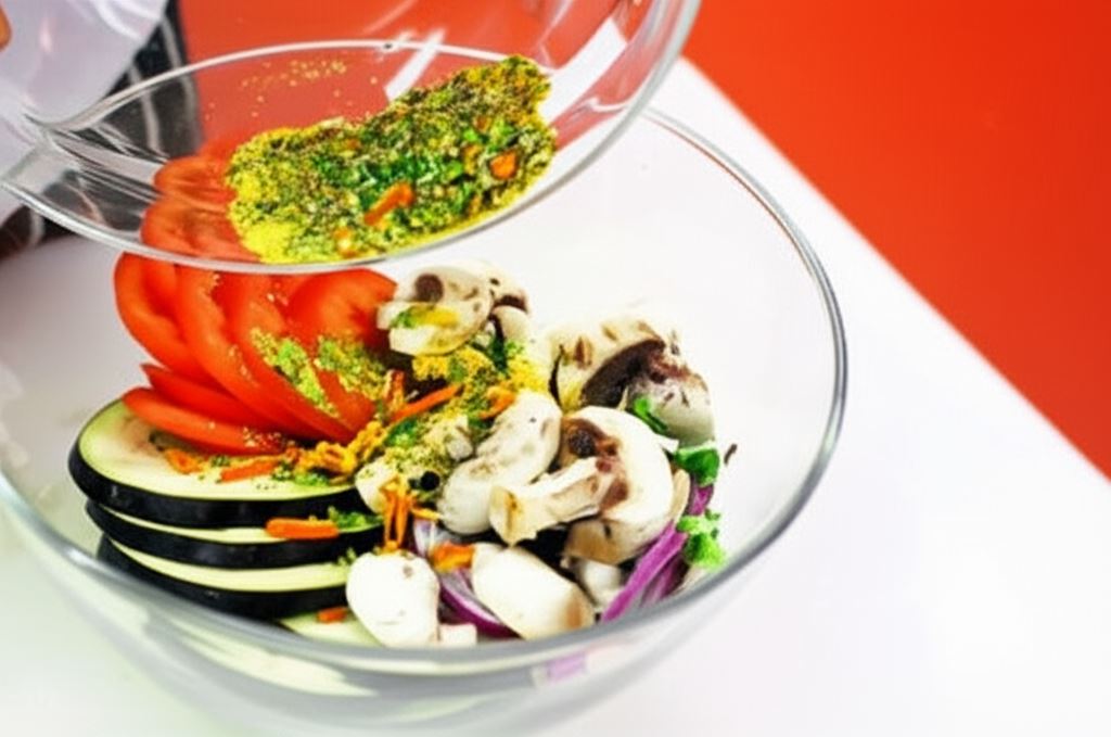 Do miski wrzuć wszystkie przyprawy oraz Przyprawę Uniwersalną Delikat Knorr. Potem dodaj mieszankę przypraw do warzyw i całość starannie wymieszaj.