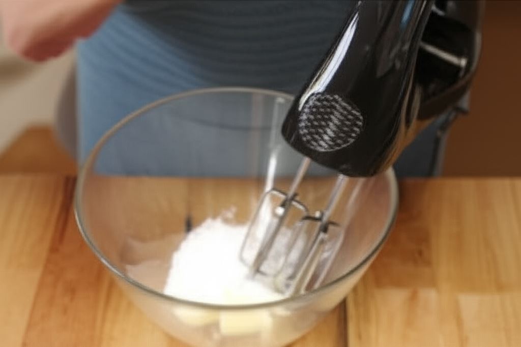 Sporządź krem: Ubij wspólnie masło, cukier puder i orzechy na jednolitą, puszystą konsystencję.