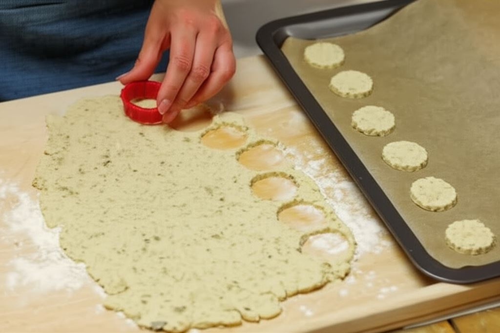 Przesiej mąkę na stolnicy, dodaj masę i zagnieć ciasto. Rozwałkuj je do grubości 5 mm i wytnij małe kółka używając np. foremki.