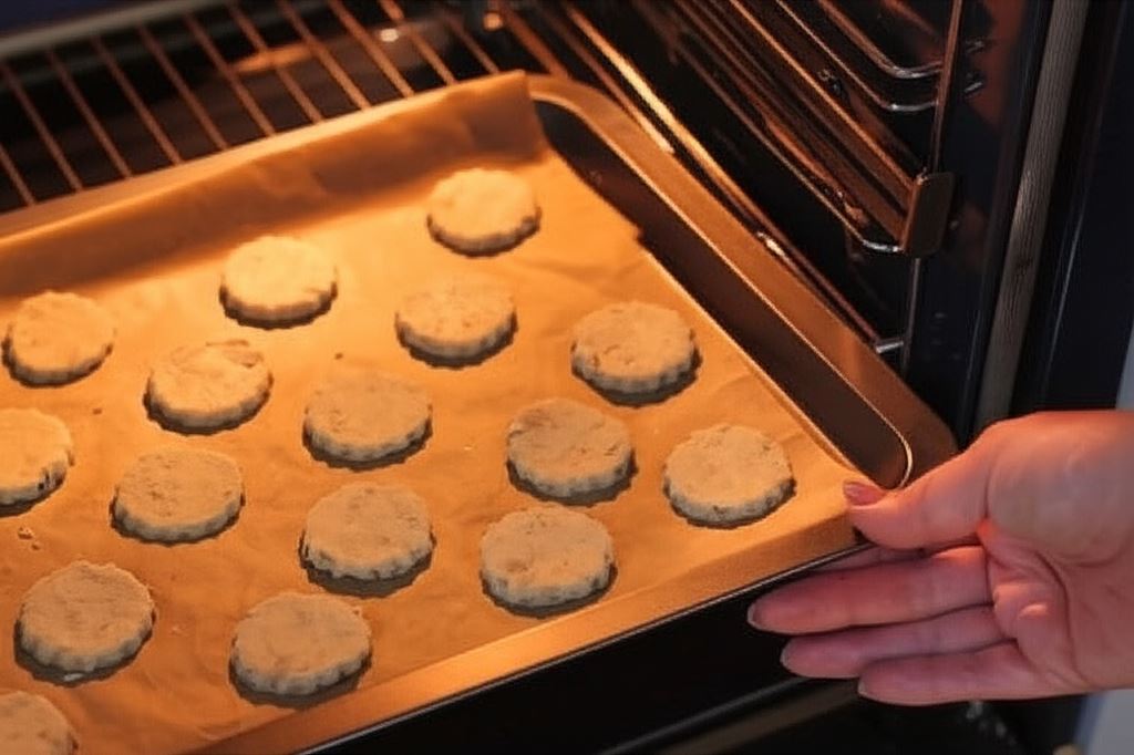 Umieść na blasze wyłożonej papierem do pieczenia i piecz w piekarniku przez 12 min. w temperaturze 180 st. C.
