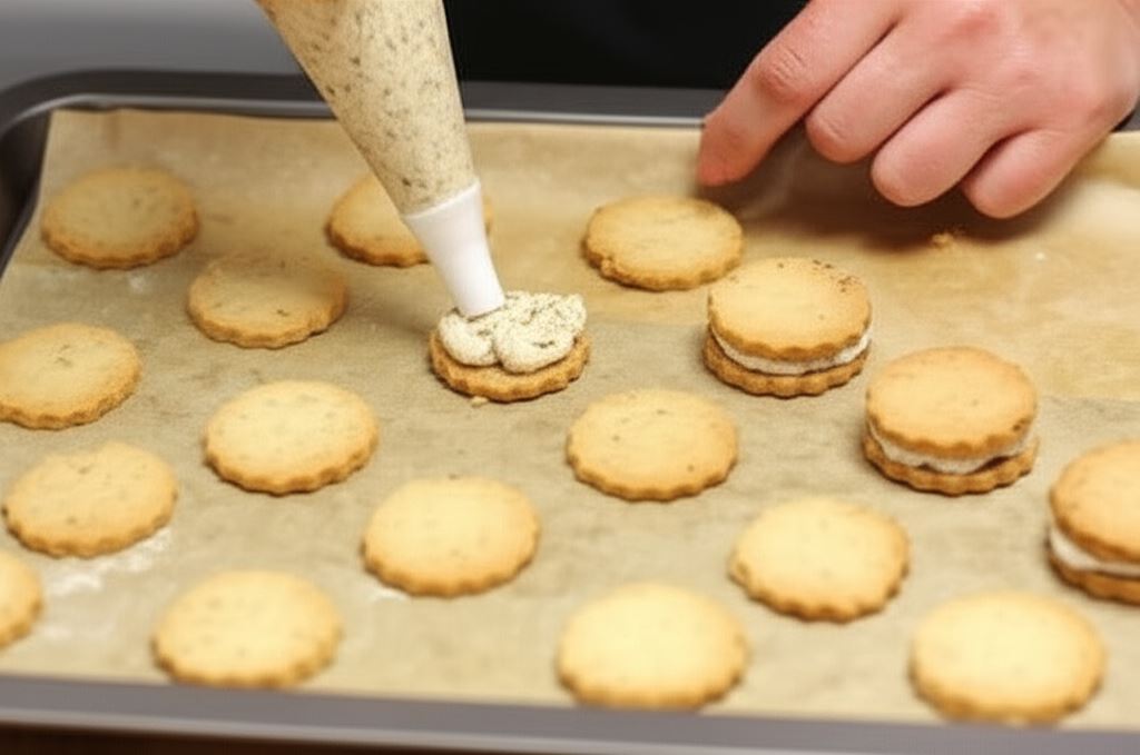 Gdy ciastka wystygną, nakładaj krem na jedno ciastko, przykrywając je i przyciskając drugim, powtarzaj do wykorzystania wszystkich ciasteczek.