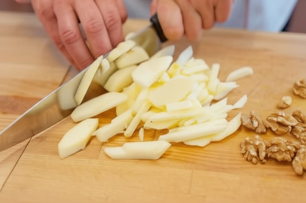 Jabłka obierz i pokrój w kosteczkę, orzechy posiekaj drobno.
