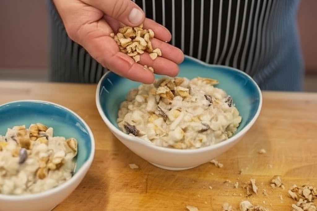 Przygotowaną owsiankę przełóż do miseczek i obsyp orzechami.