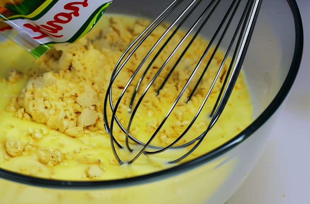 Wsyp do miski lub garnka średniej wielkości wszystkie składniki ciasta – mąkę, mleko, cukier, jaja, cynamon, proszek do pieczenia i połowę roztopionego masła. Zmiksuj wszystkie składniki mikserem do uzyskania półpłynnej, jednorodnej masy.