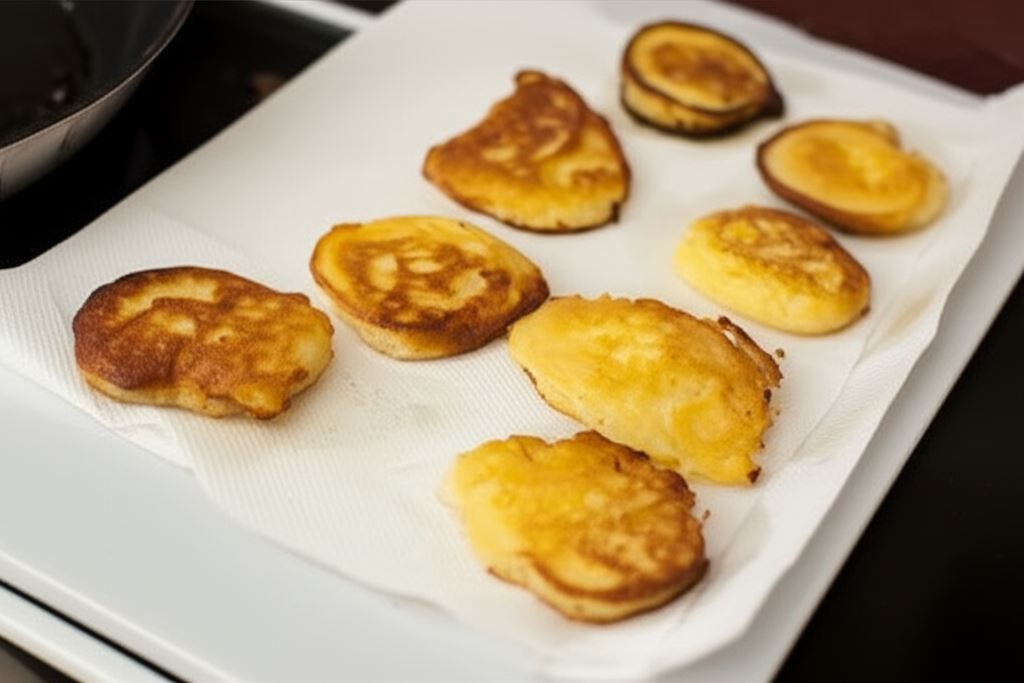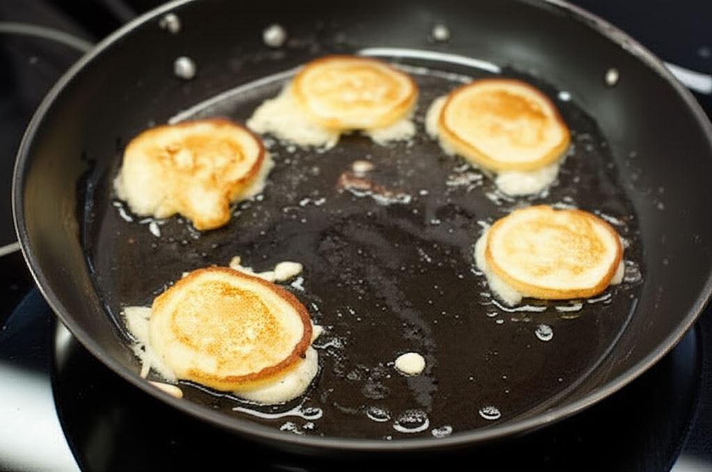 Wlej niewielką ilość oleju na patelnię z nieprzywierającą powierzchnią. Kiedy olej będzie odpowiednio rozgrzany, nakładaj ciasto przy pomocy łyżki, tworząc niewielkie, okrągłe placuszki. Smaż placuszki do złotego koloru po obu stronach.