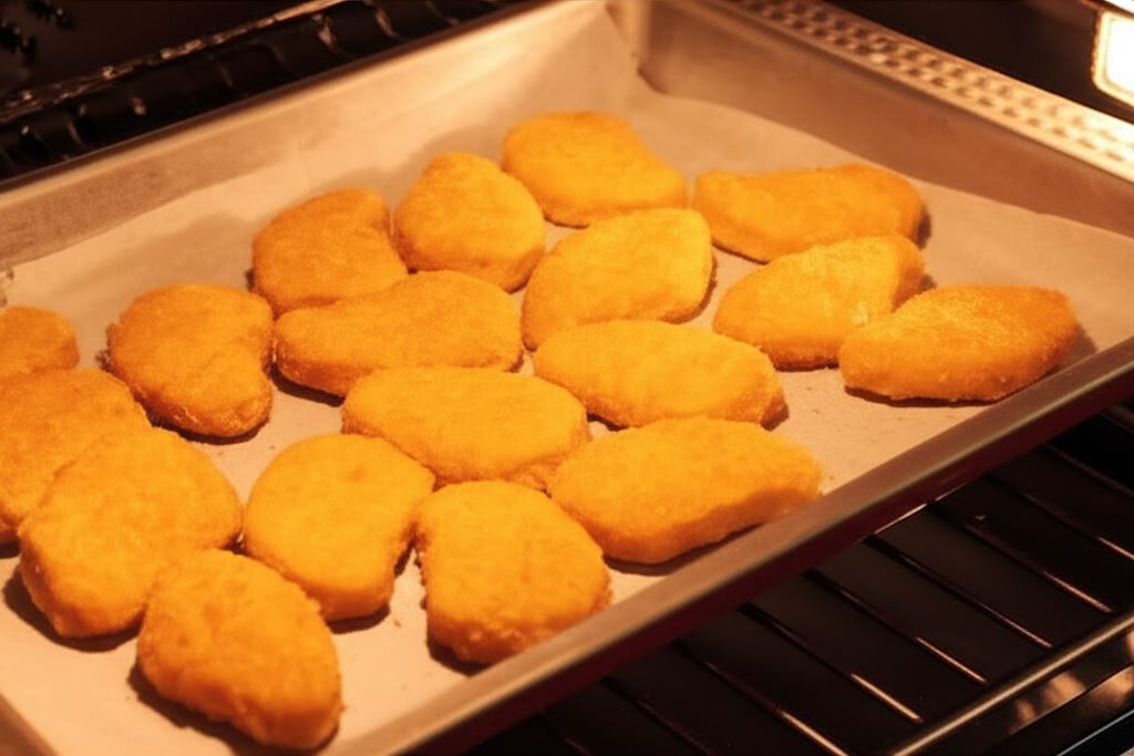Najpierw nagrzej piekarnik do 200°C z funkcją góra-dół. W międzyczasie przygotuj roślinne nuggetsy. Ułóż je równo na blasze wyścielonej papierem do pieczenia. Kiedy piekarnik osiągnie odpowiednią temperaturę, umieść w nim blachę z roślinnymi nuggetsami. Piecz przez 10 minut.