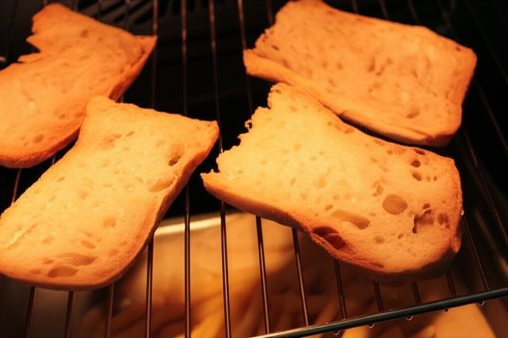 Skorzystaj z faktu, że piekarnik jest nadal gorący – przestaw go teraz na funkcję grilla. Umieść na ruszcie przecięte bułki panini i zapiekaj je przez około 2 minuty z każdej strony.