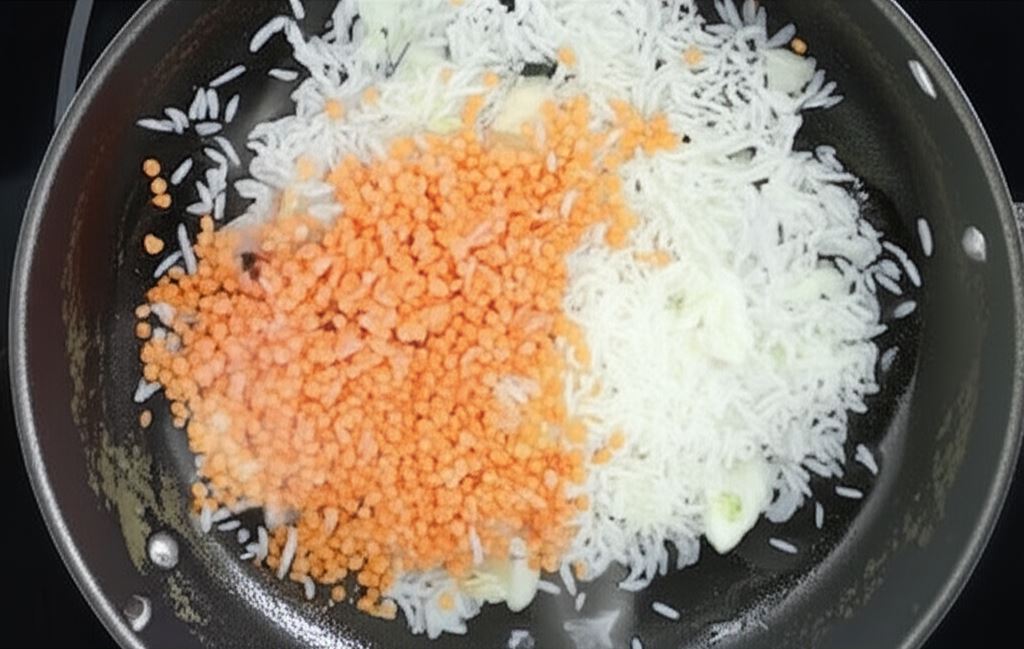 Posiekaną cebulę i czosnek zrumień na oliwie, wsyp ryż i soczewicę. Podsmażaj moment.