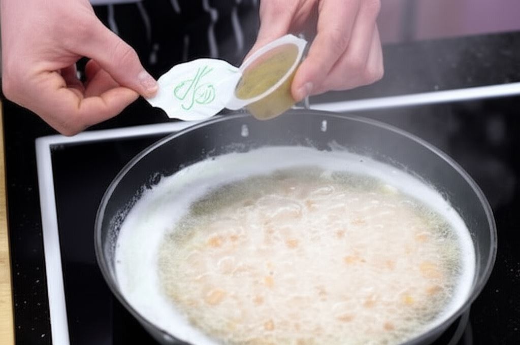 Wlej wodę, aby całkowicie pokryła składniki. Wsyp Bulion warzywny Knorr.