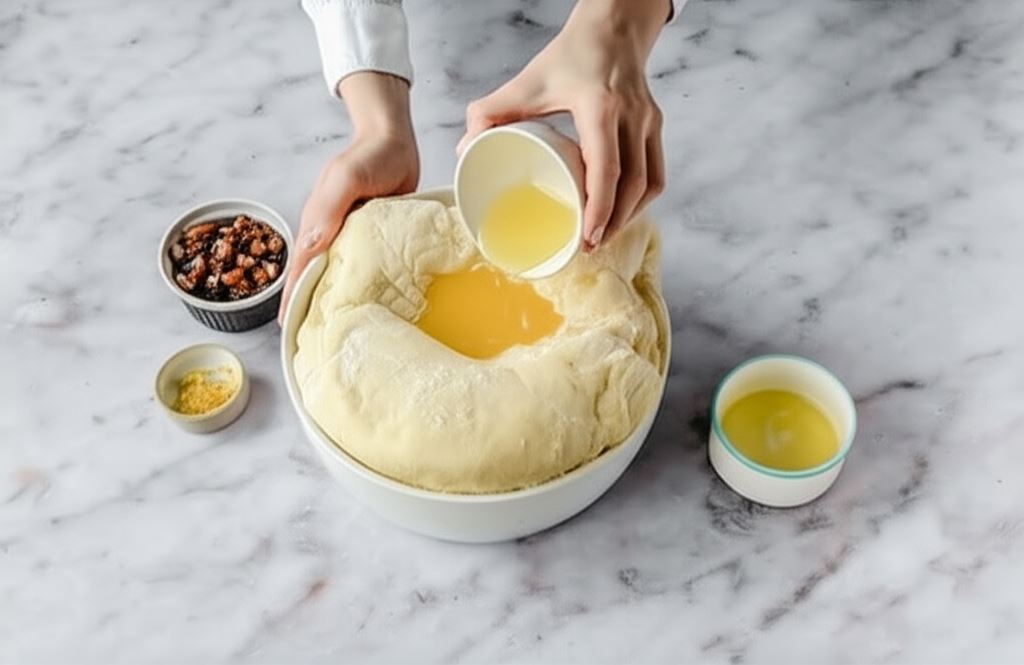 Wyrośnięte drożdże wlewamy do dużej miski z mąką. Potem dodajemy ubite żółtka i resztę ciepłego mleka. Całość solimy i starannie wyrabiamy. Tworzymy z ciasta kulę, nakrywamy ściereczką i odkładamy w ciepłe miejsce, aż podwoi swoją objętość (ok. 1 h).