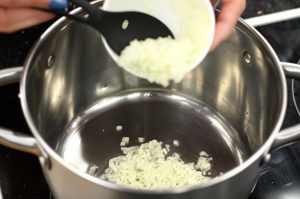 Cebulę i czosnek obierz oraz drobno posiekaj. Oba składniki zrumień w garnku na rozgrzanej oliwie.