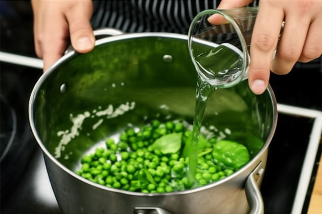 Wsyp mrożony groszek i liście mięty. Wszystko zalej niecałą szklanką wody i gotuj pod przykryciem około 5 minut.