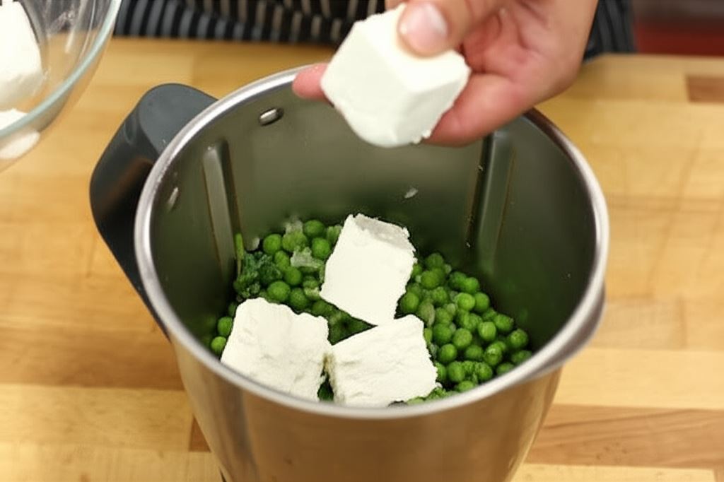 Groszek umieść wraz z płynem do naczynia miksera i dołóż twaróg.