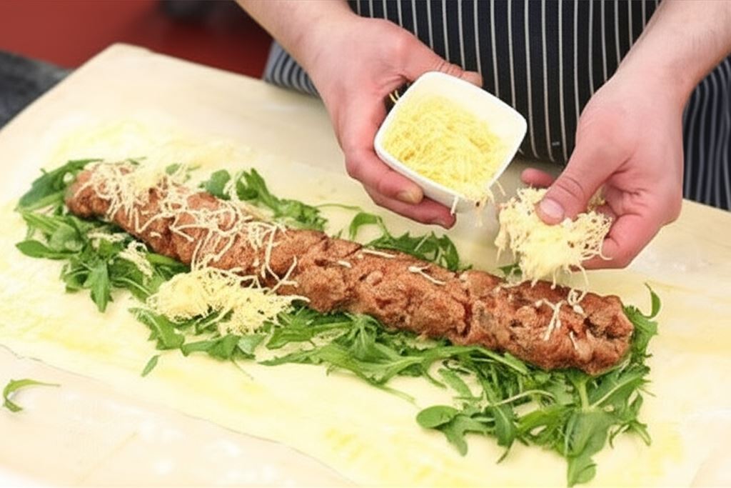 Ciasto francuskie rozwałkuj na oprószonej mąką stolnicy i posmaruj jajkiem. Na środku połóż liście rukoli i mięsny farsz. Całość oprósz serem.