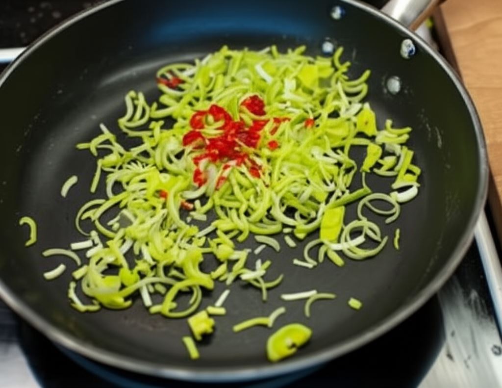 Na rozgrzanej patelni z oliwą z oliwek zrumień pokrojonego pora i papryczkę chili.