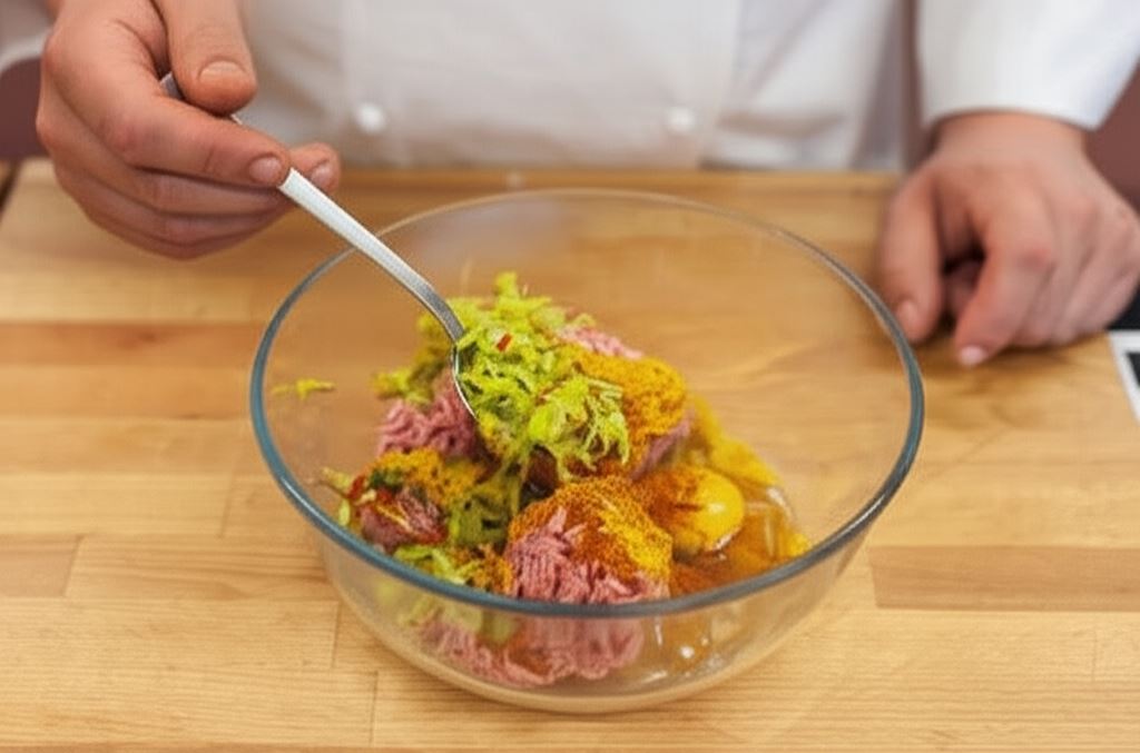 Mięso umieść w misce, wsyp dwa jaja, bułkę tartą, curry, paprykę, podsmażone uprzednio składniki i przyprawę Knorr. Starannie wymieszaj wszystkie składniki.