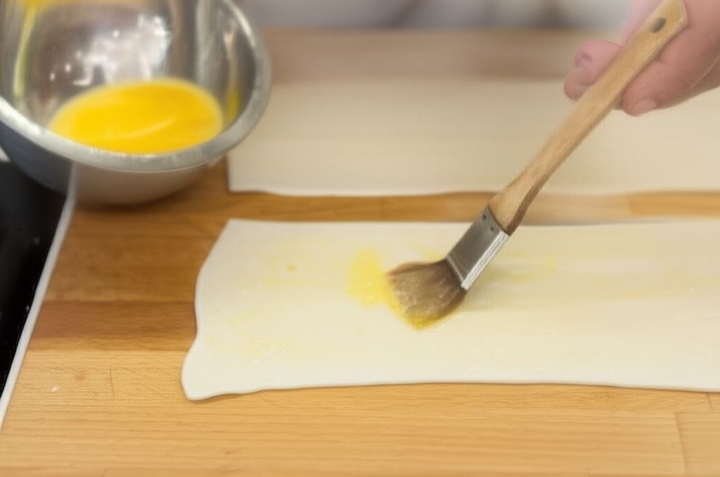 Odmrożone ciasto francuskie przetnij wzdłuż na dwie części i posmaruj resztą roztrzepanego jajka.