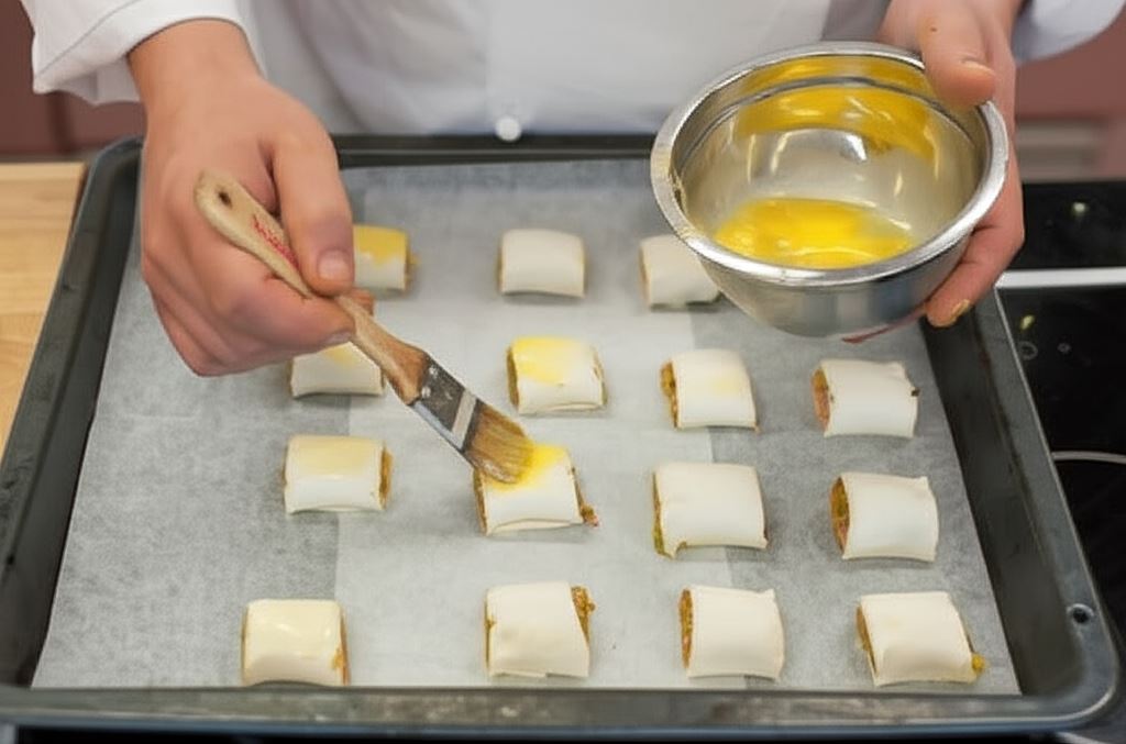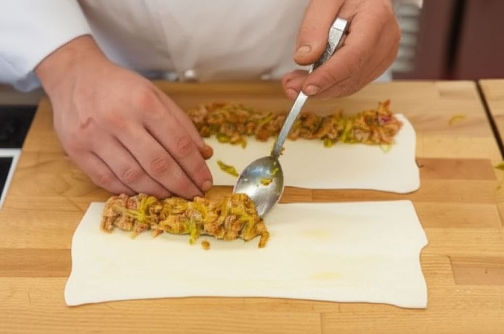Na dłuższej stronie paska ułóż farsz, zwiń ciasno ciasto. Powstałą roladkę pokrój na kawałki o długości około 4 cm.