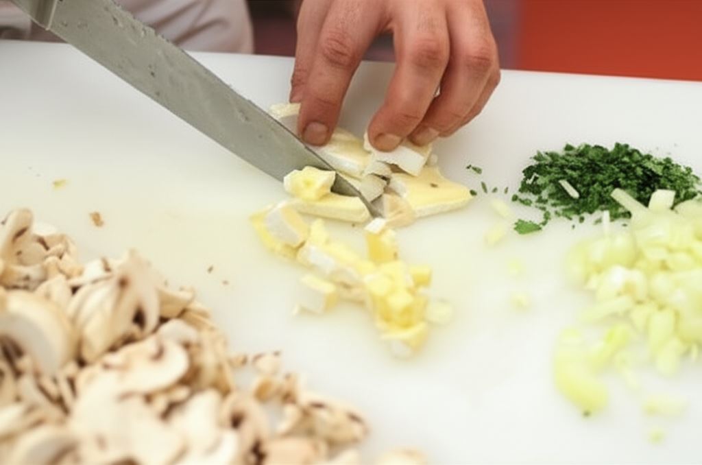 Pieczarki oraz cebule pokrój na cząstki. Natkę posiekaj, a ser pokrój w małą kostkę.