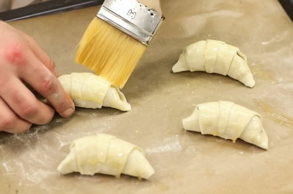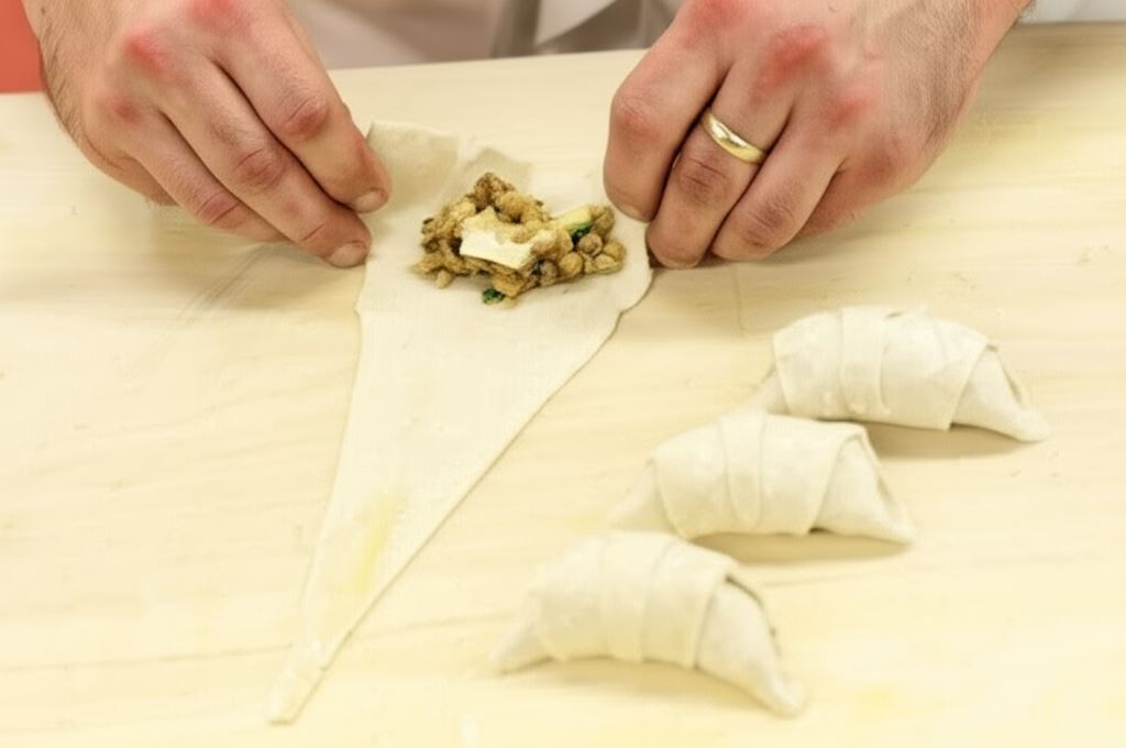 Ciasto francuskie rozwałkuj na grubość 2 milimetrów. Wytnij trójkąty posiadające dwa znacznie dłuższe boki. Umieszczaj na środku każdego trójkąta po łyżce nadzienia i formuj rogaliki.