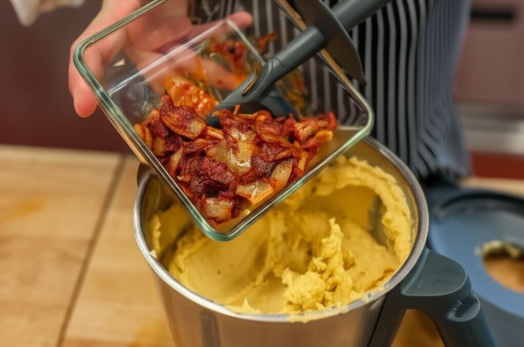 Na rozgrzanym tłuszczu zrumień pokrojoną cebulę. Kiedy się zeszkli, wsyp na patelnię posiekany czosnek i przyprawy (włączając delikat warzywny). Smaż je dopóki nie zaczną mocno pachnieć. Następnie dodaj koncentrat pomidorowy. Całość smaż jeszcze moment, po czym przełóż do blendera, w którym wcześniej miksowany był groch. Zblenduj składniki dokładnie na jednolitą pastę i połącz z pozostałą ciecierzycą.