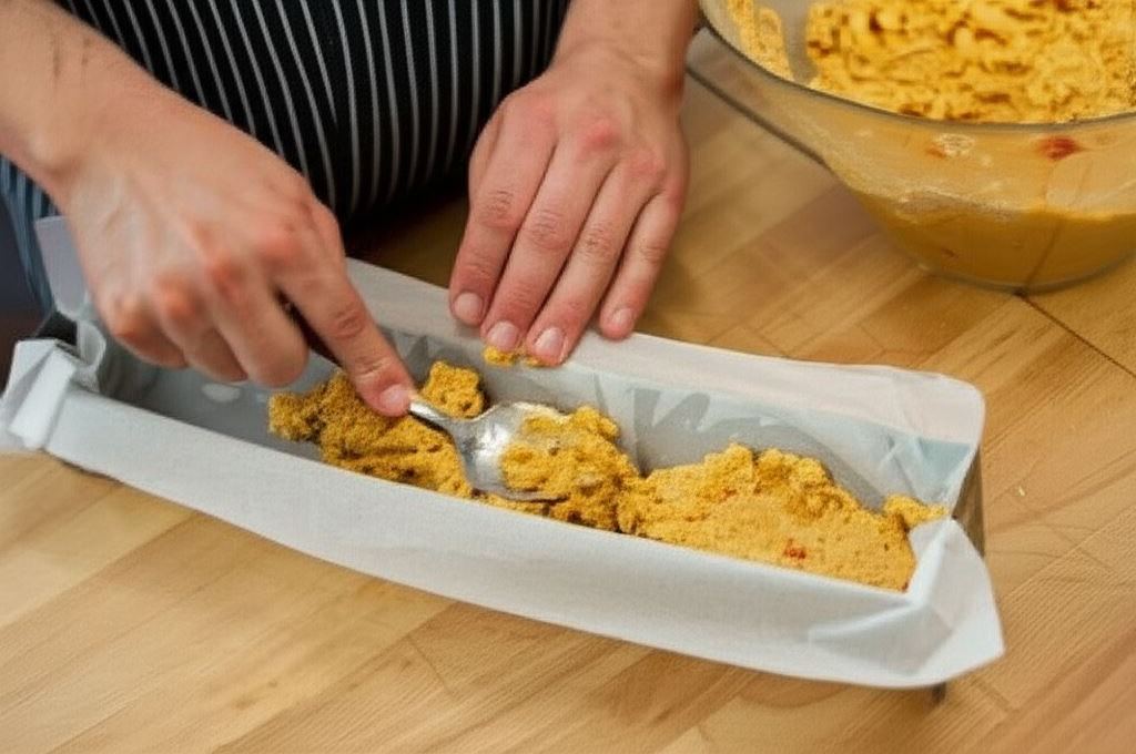 Formę na pasztet wyłóż papierem do pieczenia i umieść w niej przygotowaną masę. Całość owiń folią aluminiową, umieść na blasze do pieczenia z wlaną wodą i wstaw do rozgrzanego do 190°C piekarnika na około 50 minut.