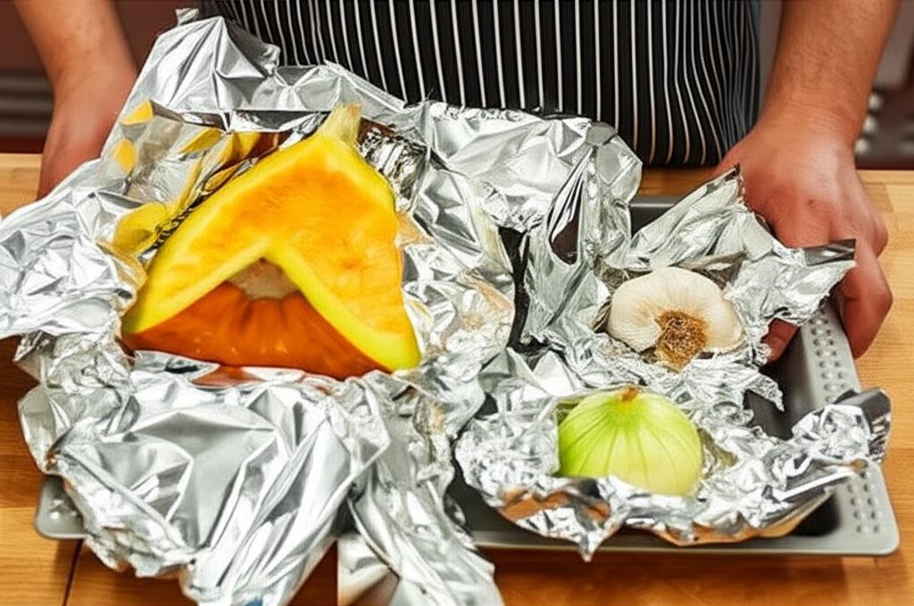 Dynię podziel na cztery części owiń w folię aluminiową, tak samo postąp z cebulą i czosnkiem. Potem umieść w piekarniku rozgrzanym do 190°C na około 15 minut. Po upływie tego czasu dynię, cebulę i czosnek obierz. Warzywa nie muszą być całkowicie upieczone.