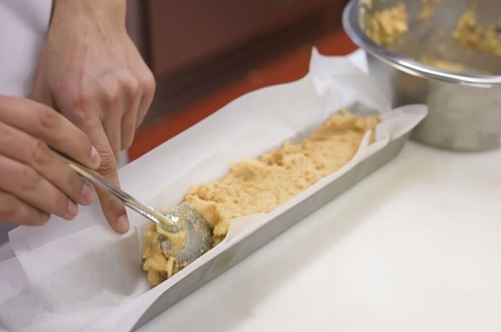Przelej masę pasztetową z selera do formy wyścielonej papierem do pieczenia, wypiekaj około 80 minut w temperaturze 180°C.