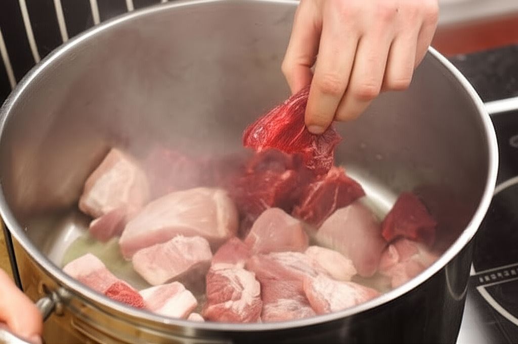 Wszystkie mięsa z wyjątkiem wątróbki potnij na drobniejsze kawałki, zrumień na silnie nagrzanym tłuszczu, umieść w garnku i zalej niewielką ilością wody – taką, by zakryła mięso.