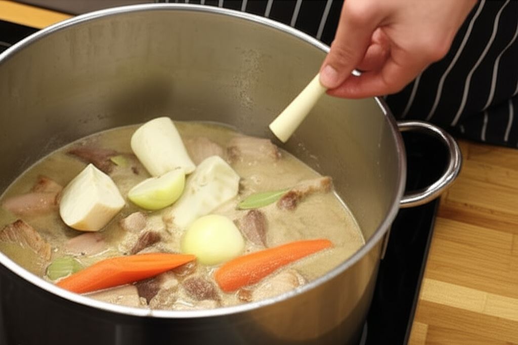 Do garnka wrzuć obrane warzywa, liść i ziele. Zagotuj całość, zbierz szumowiny z powierzchni i duś mięso aż stanie się bardzo miękkie. Około kilkanaście minut przed zakończeniem duszenia dodaj również wątróbkę.