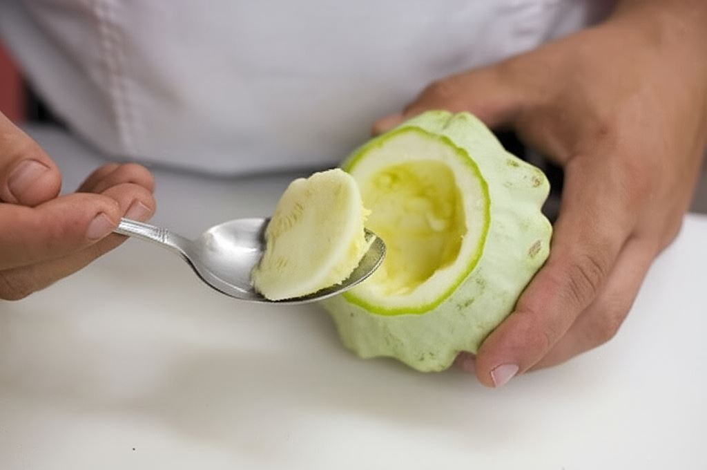 Odetnij wierzchy patisonów na 1/3 wysokości. Wydrąż środek i posiekaj drobno.