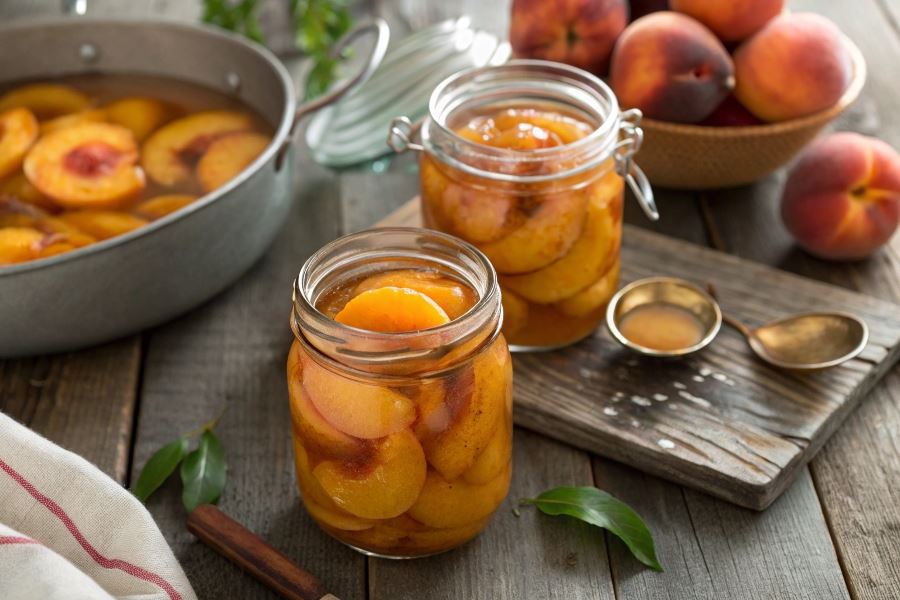 Przygotowane brzoskwinie układamy w słoikach, zalewamy gorącym syropem (90-95°C) pozostawiając około 1,5 cm wolnej przestrzeni od góry. Słoiki zamykamy wysterylizowanymi zakrętkami i pasteryzujemy w temperaturze 85-90°C przez około 20 minut. Po pasteryzacji słoiki odstawiamy do wystygnięcia, najlepiej do góry dnem, co dodatkowo uszczelni zamknięcie.