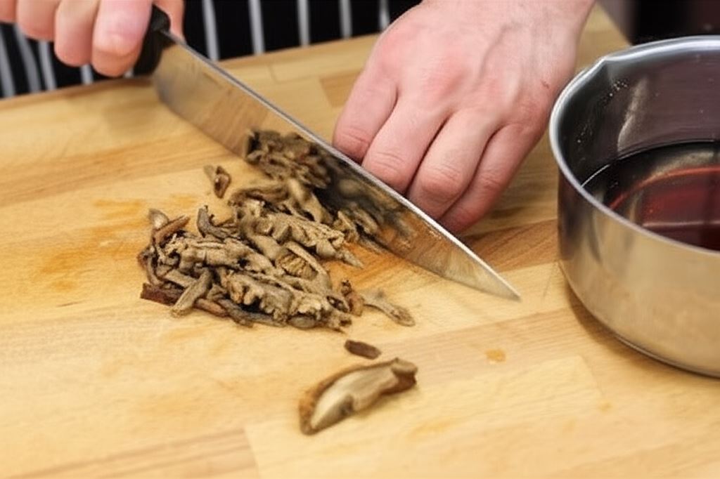 Grzyby zamocz w gorącej wodzie (500 ml). Kiedy zmiękną, odcedź je i potnij w cienkie paski. Wywar zachowaj.