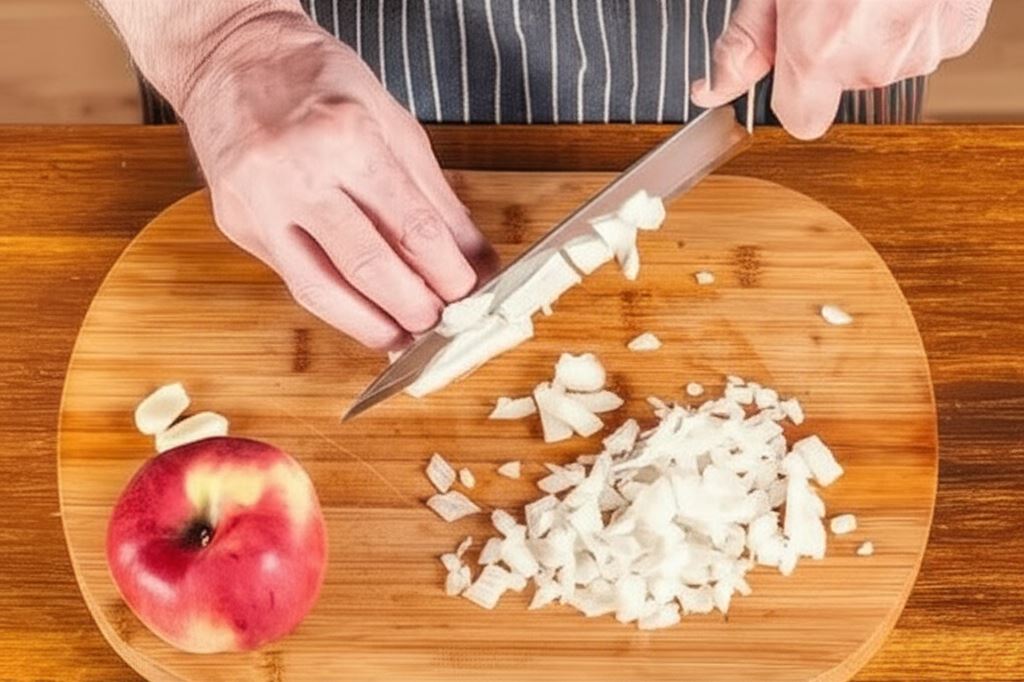 Cebule i czosnek posiekaj na drobną kosteczkę. Jabłko obierz i posiekaj w drobną kostkę podobnie jak cebulę.