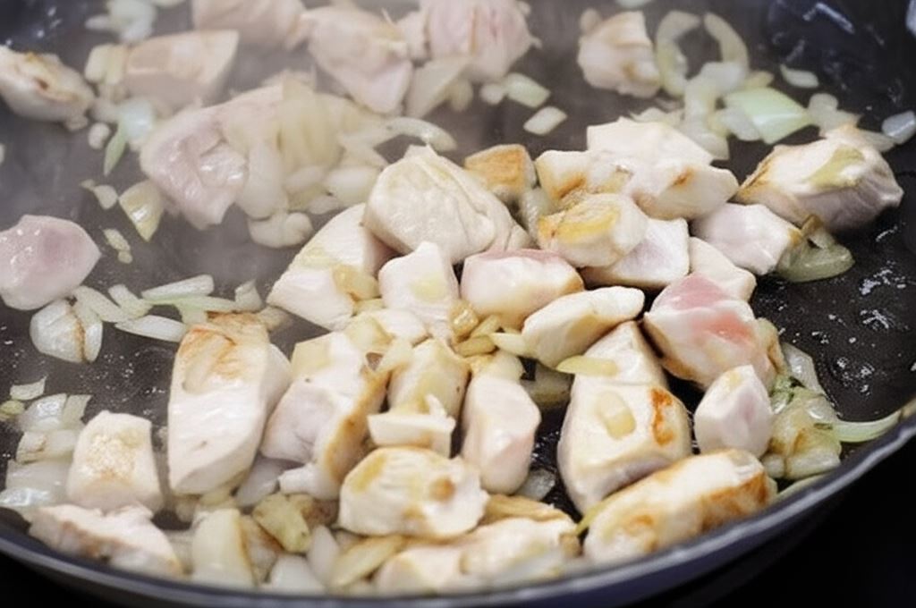 Na patelni zrumień pokrojoną w kostkę cebule i pokrojoną w kostkę pierś kurczaka.