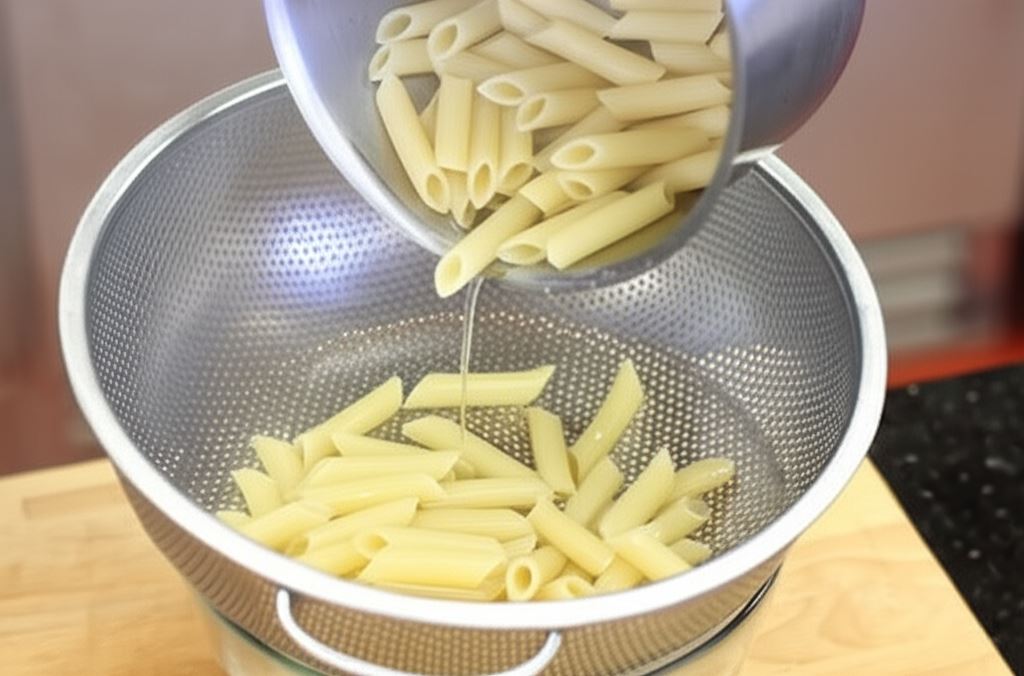 Weź duży garnek, wlej do niego wodę i ugotuj makaron al dente według instrukcji zamieszczonej na opakowaniu. Potem odcedź go przy użyciu sitka i odstaw.