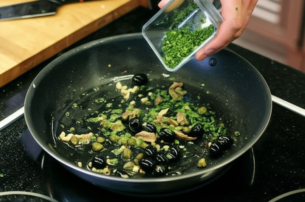 Przygotuj deskę do krojenia i drobno posiekaj pietruszkę oraz filety z anchois. Na patelni rozgrzej dwie łyżki oliwy i dodaj czosnek przepuszczony przez praskę. Gdy czosnek delikatnie się zrumieni, dodaj pietruszkę, oliwki, kapary, anchois i wcześniej ugotowany makaron. Delikatnie podsmaż wszystko, często mieszając, przez około 5 minut.