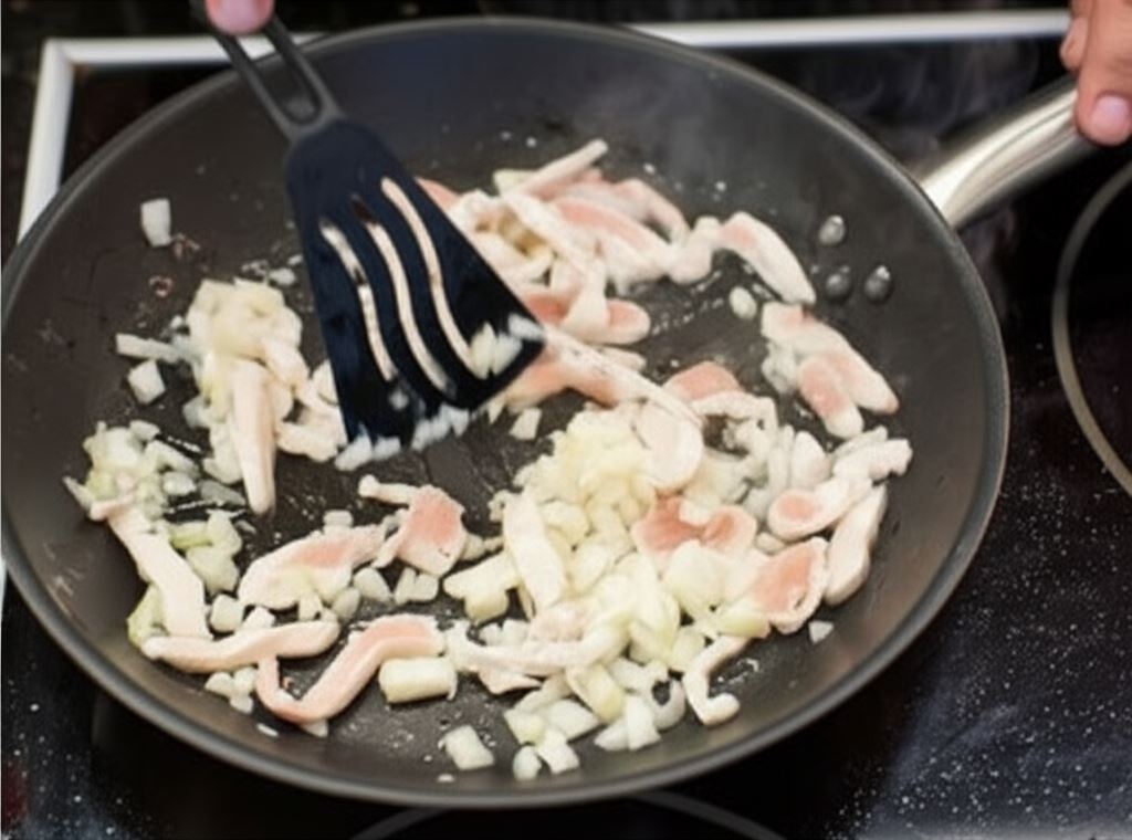 Na patelni obsmaż kurczaka z cebulą i czosnkiem. Gdy będzie zrumieniony dolej na patelnię wodę.