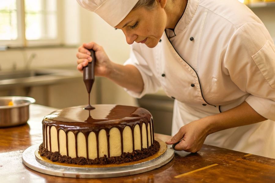 Profesjonaliści używają specjalnych technik aplikacji – jednym płynnym ruchem wylewają glazurę na środek tortu, pozwalając jej samodzielnie rozpłynąć się po bokach. Unikaj wielokrotnego poprawiania – każda ingerencja w zastygającą glazurę pozostawia ślady.