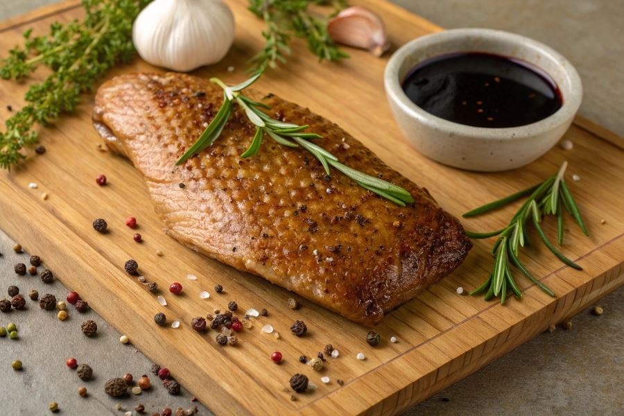 Kluczem do zrównoważonego smaku jest balans słodko-słonego profilu – miód neutralizuje nadmierną słoność sosu sojowego, jednocześnie tworząc na powierzchni kaczki karmelizowaną skórkę podczas pieczenia. Imbir i czosnek zapewniają ostrość i aromat, a przyprawy azjatyckie dodają głębi.