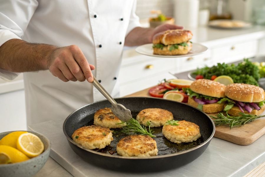 Sekret profesjonalnych burgerów rybnych tkwi w temperaturze – masa powinna być dobrze schłodzona przed formowaniem, co zapobiega rozpadaniu się kotletów podczas obróbki termicznej.