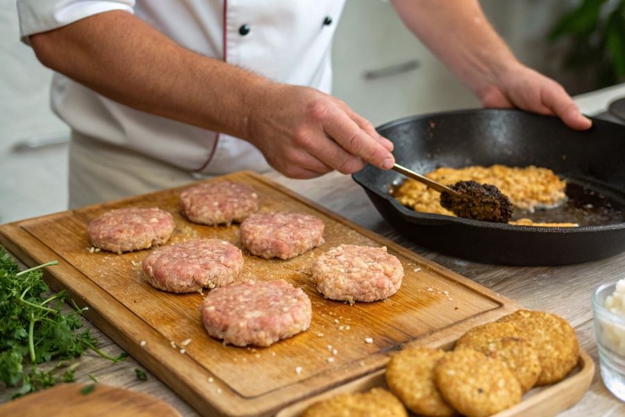 Najczęstsze błędy przy dodawaniu chleba to zbyt duża ilość (powyżej 200 g/kg), która powoduje rozpadanie się kotletów podczas smażenia, oraz niedokładne rozdrobnienie, skutkujące nierównomierną teksturą. Warto pamiętać, że świeżość chleba ma znaczenie – pieczywo czerstwe (2-3 dni) lepiej chłonie płyny i zapewnia bardziej jednolitą konsystencję masy mięsnej.