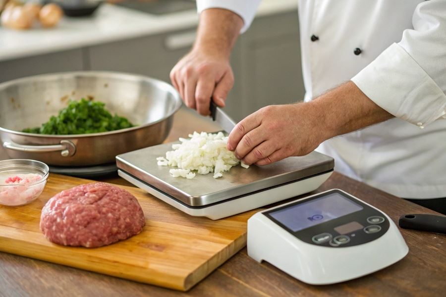 - Mięso wołowe: 180-220g cebuli na kg (chudsze mięso potrzebuje więcej wilgoci)